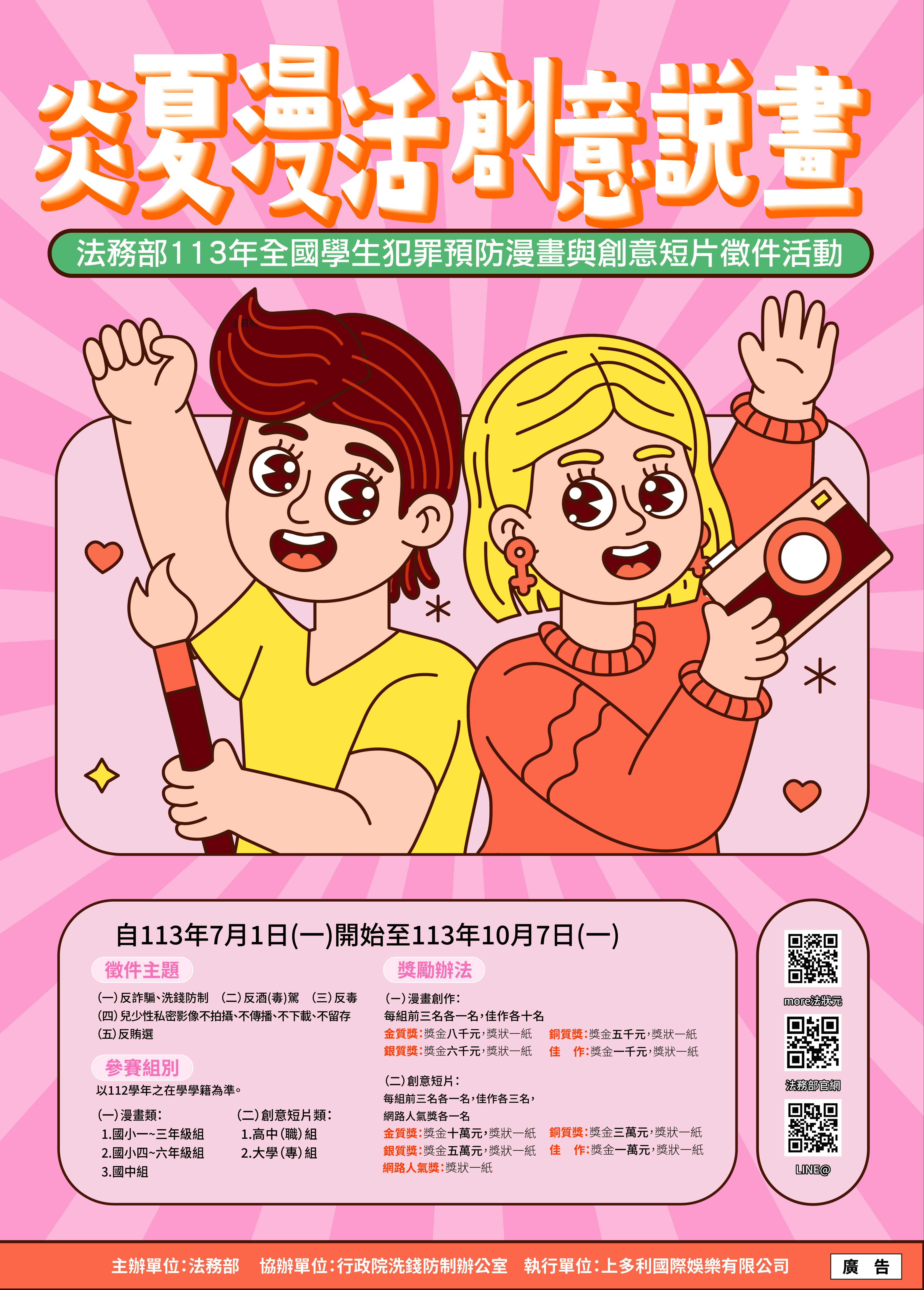 三、徵稿期間自113年7月1日至10月7日,採線上報名,有關徵 稿活動相關訊息及報名資料下載,請於7月1日至下列網站 搜尋:活動官網、 法務部「More法狀元」網站「年度活動」或facebook搜尋:More法狀元-兒童及青 少年犯罪預防宣導網。