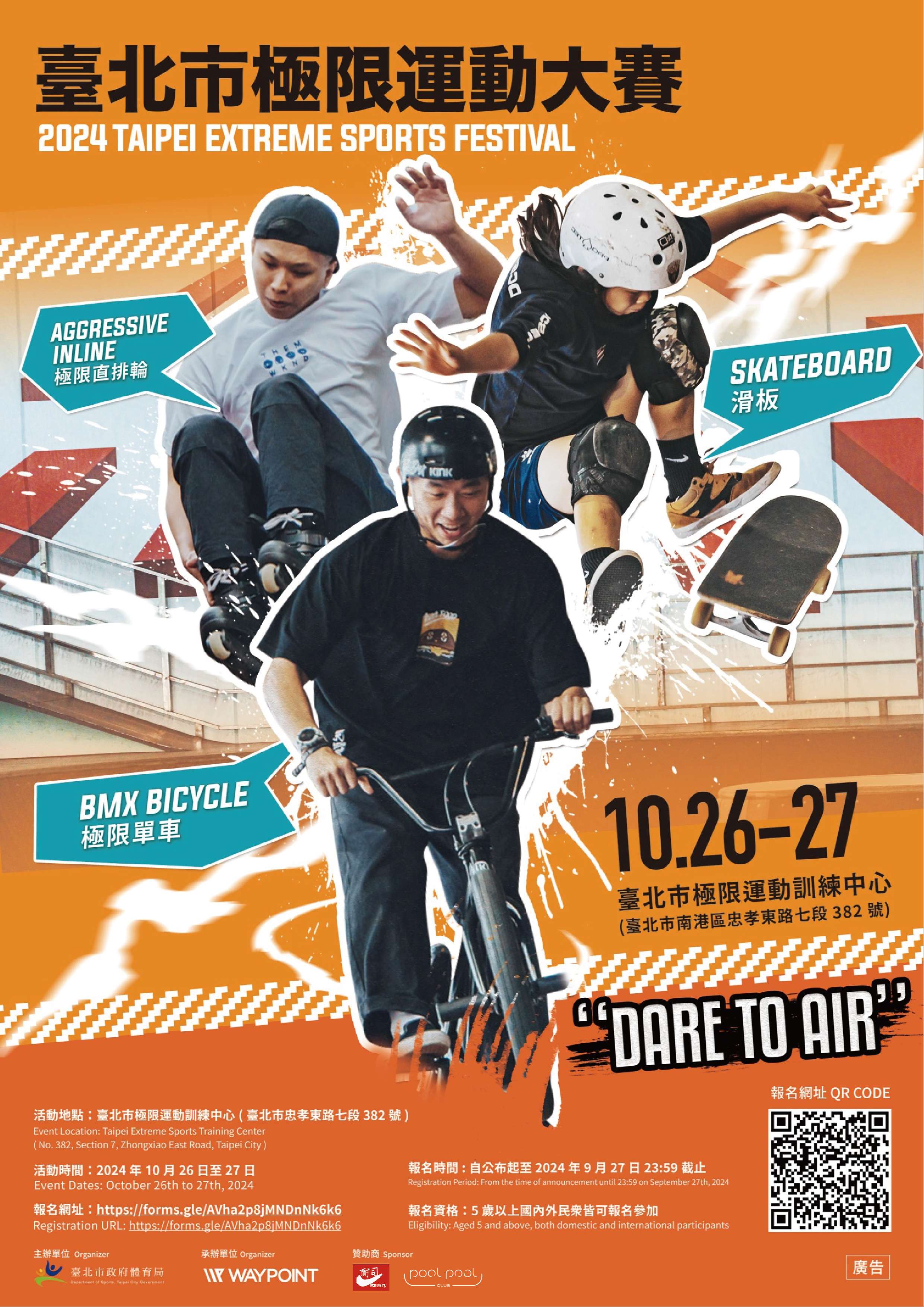 一、旨揭活動由本局主辦,威整合運動股份有限公司(下稱該公 司)承辦,訂於113年(以下同)10月26日至27日(星期六、 日)假臺北市極限運動訓練中心舉辦,自即日起至9月27日 開放報名,請貴機關/院校協助於所屬管道宣傳報名訊 息。
