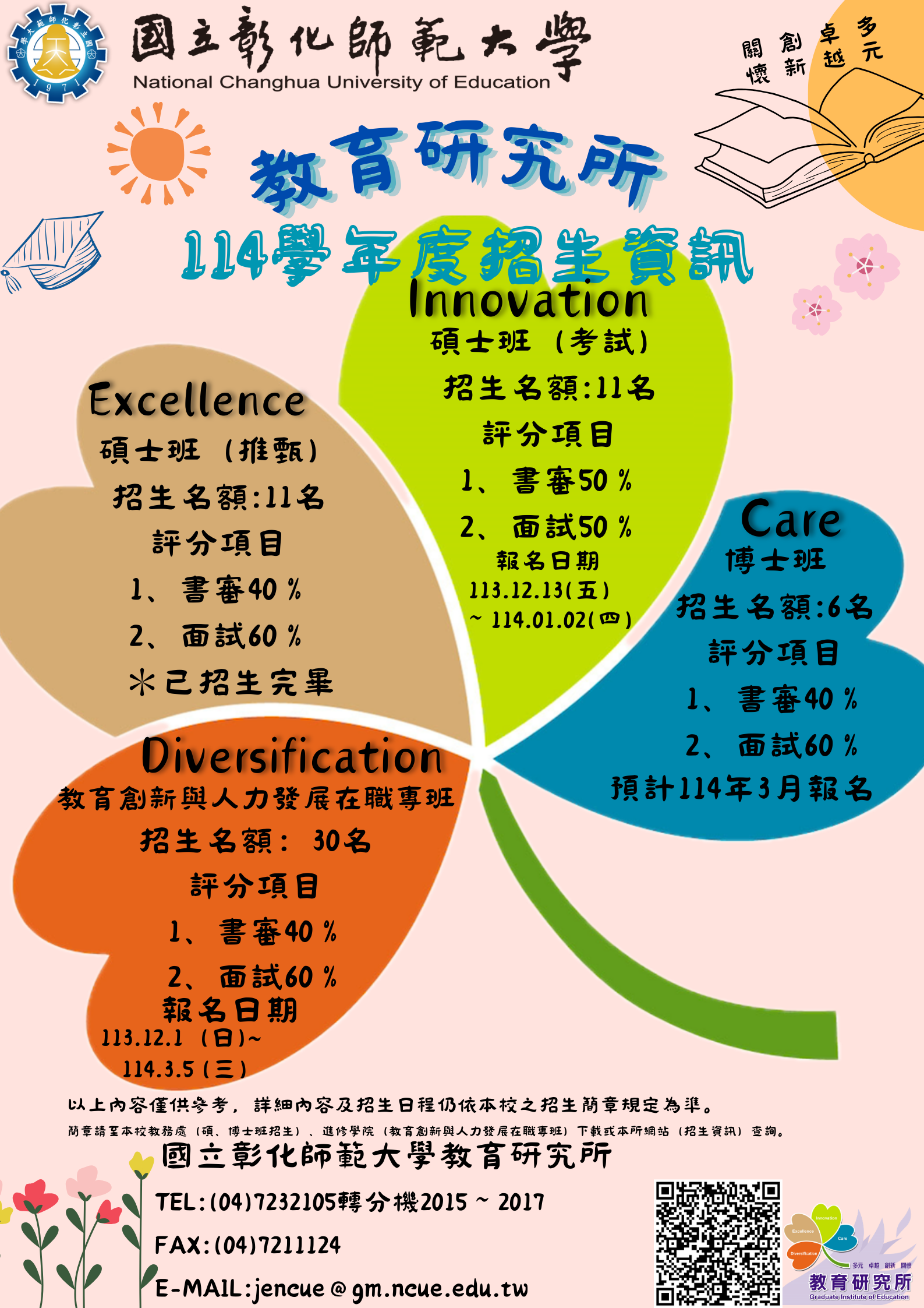 一、國立彰化師範大學教育研究所114學年度碩士班招生考試簡章自即日起於教務處網站開放下載(另開新視窗)。