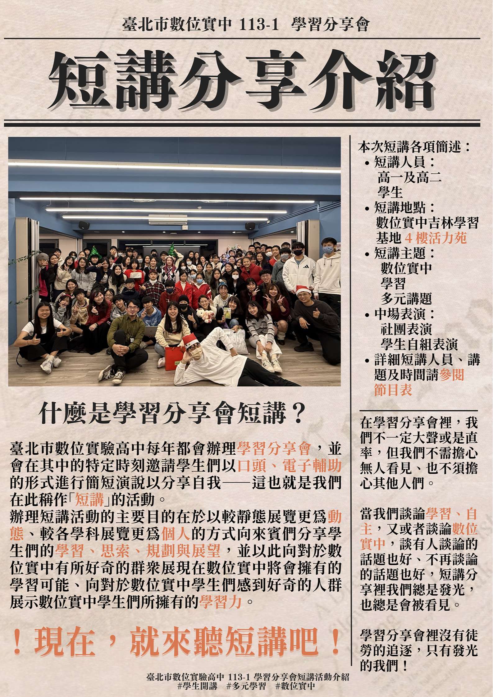 一、為促進校際間學習經驗交流與教學創新發展,並提供學生展示學習成果與分享經驗的平台,本校特辦理學習分享會活動,歡迎各界參與。