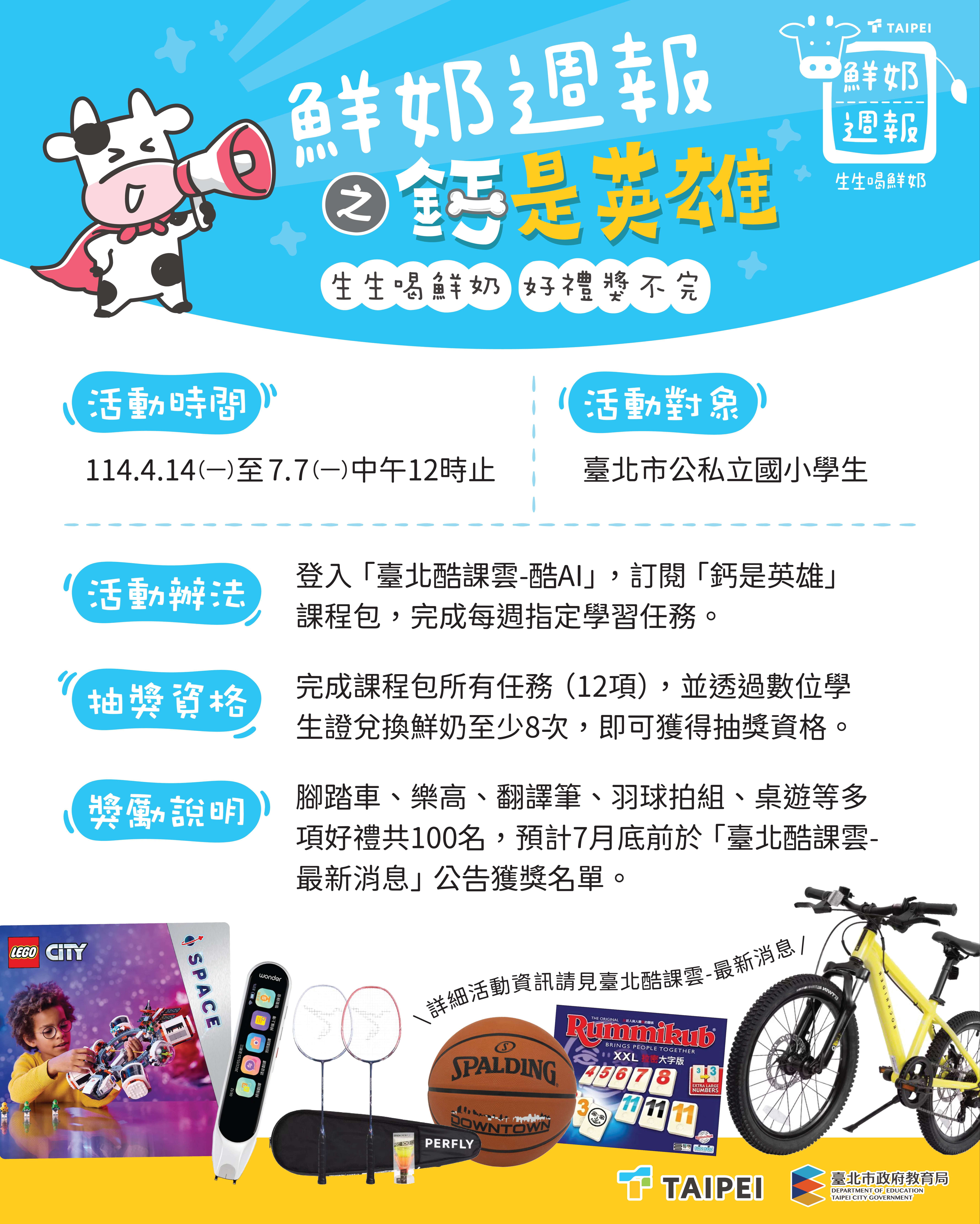 二、鼓勵學生積極參加酷AI課程包自主學習 活動「鮮奶週報-鈣是英雄」,活動概述如下: