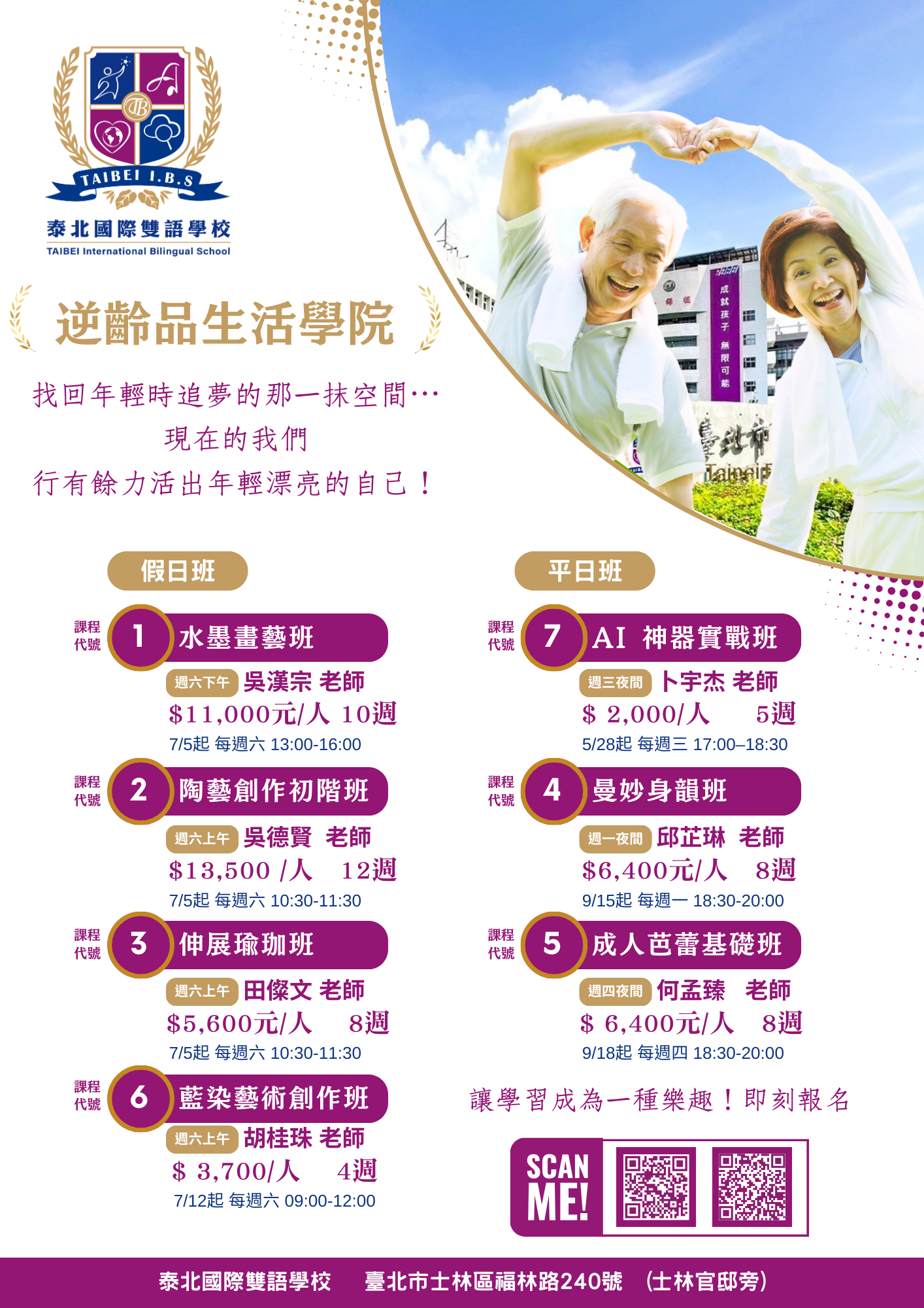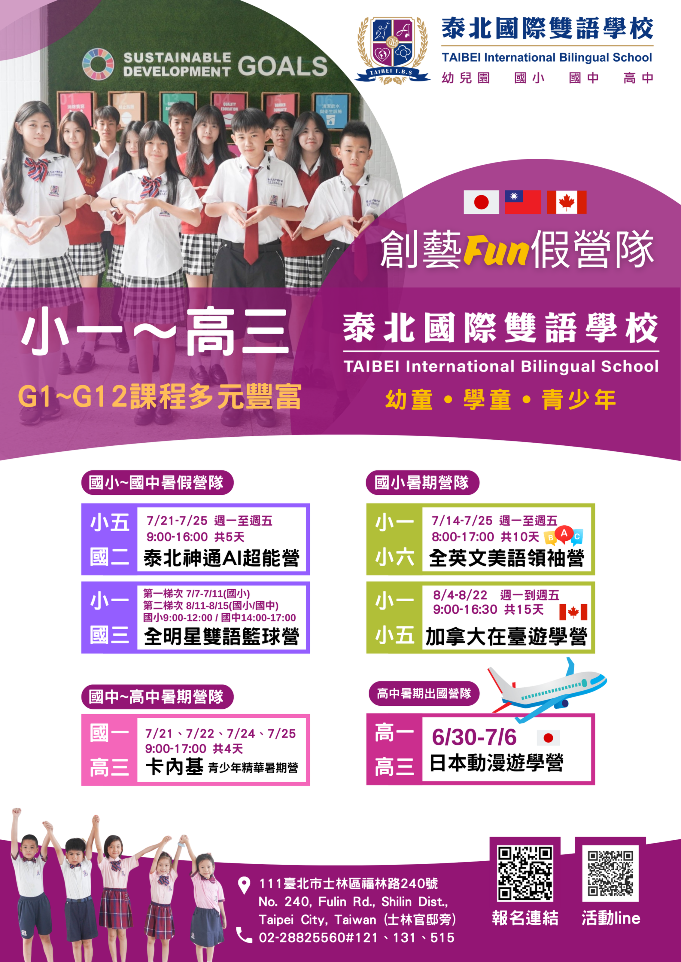一、本校為提升學生假期學習效益與成人週末充實生活,特規 劃多元營隊與終身學習課程,結合國際教育、科技應用、 藝術素養與身心療癒等主題融入課程。
