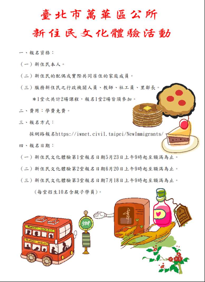 二、宣導文稿如下:「臺北市萬華區公所將於114年6月1日、6 月28日、7月26日3場次,假臺北市臺北市萬華區辦理文化 體驗活動歡迎報名參加,報名網址: https://iwnet. civil.taipei/NewImmigrants/。詳情請參閱萬華區公所網 站或電洽(02)2306-4468轉204陸先生」。