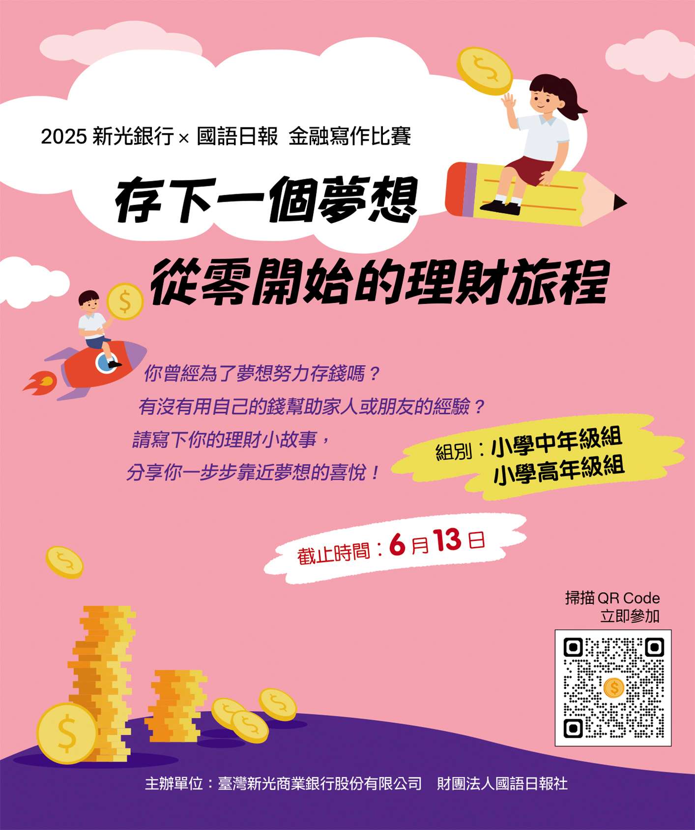 一、為提升兒童的財商素養,讓孩子了解金錢的價值與管理能 力,本社與臺灣新光商業銀行共同舉辦「存下一個夢想 從 零開始的理財旅程」徵文活動。