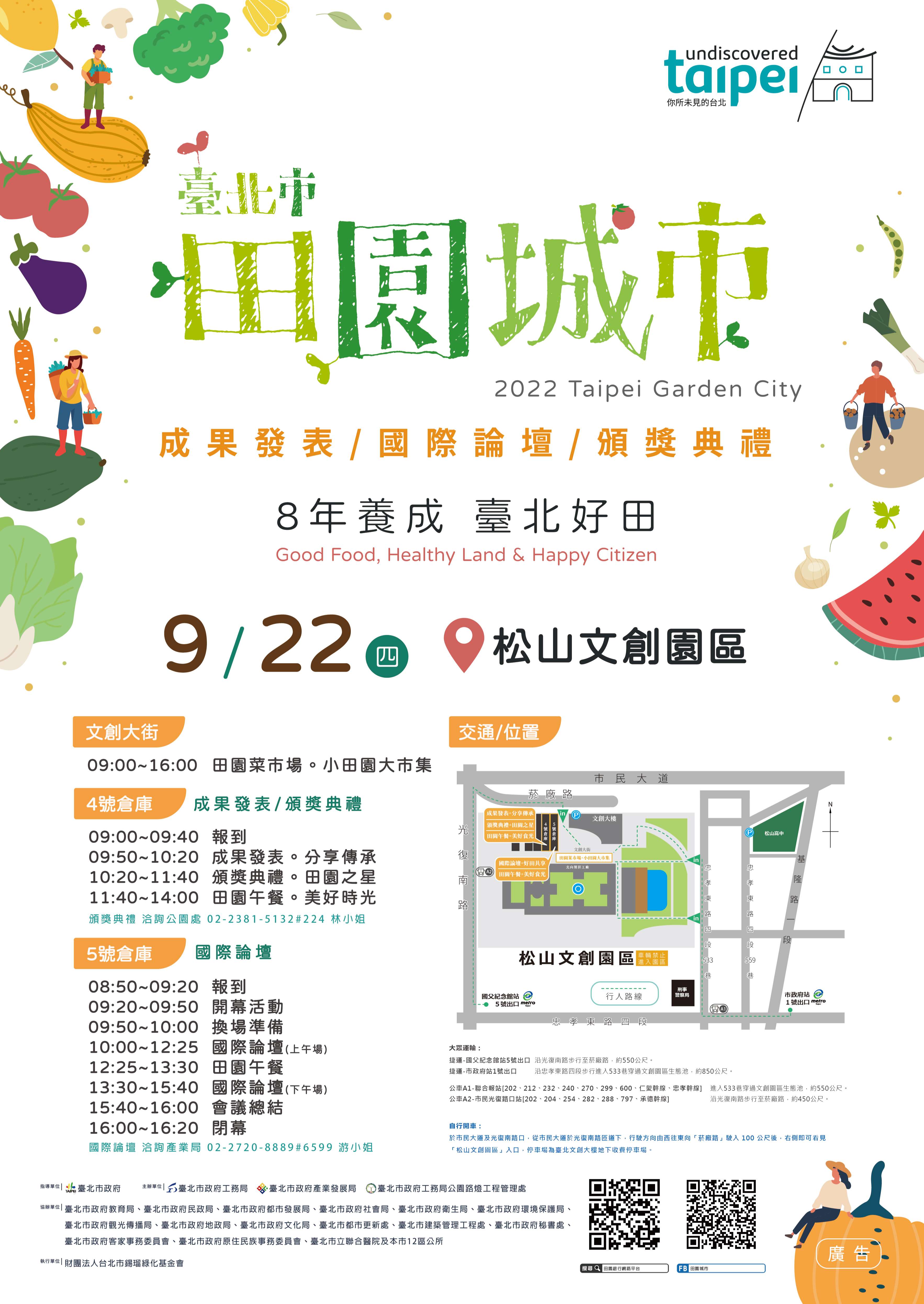 二、旨揭活動訂於111年9月22日(星期四)上午9時至下午4時於 本市松山文創園區舉辦,活動主題含田園市集(文創大 街)、頒獎典禮暨成果發表會(4號倉庫)及國際論壇(5號倉 庫)。