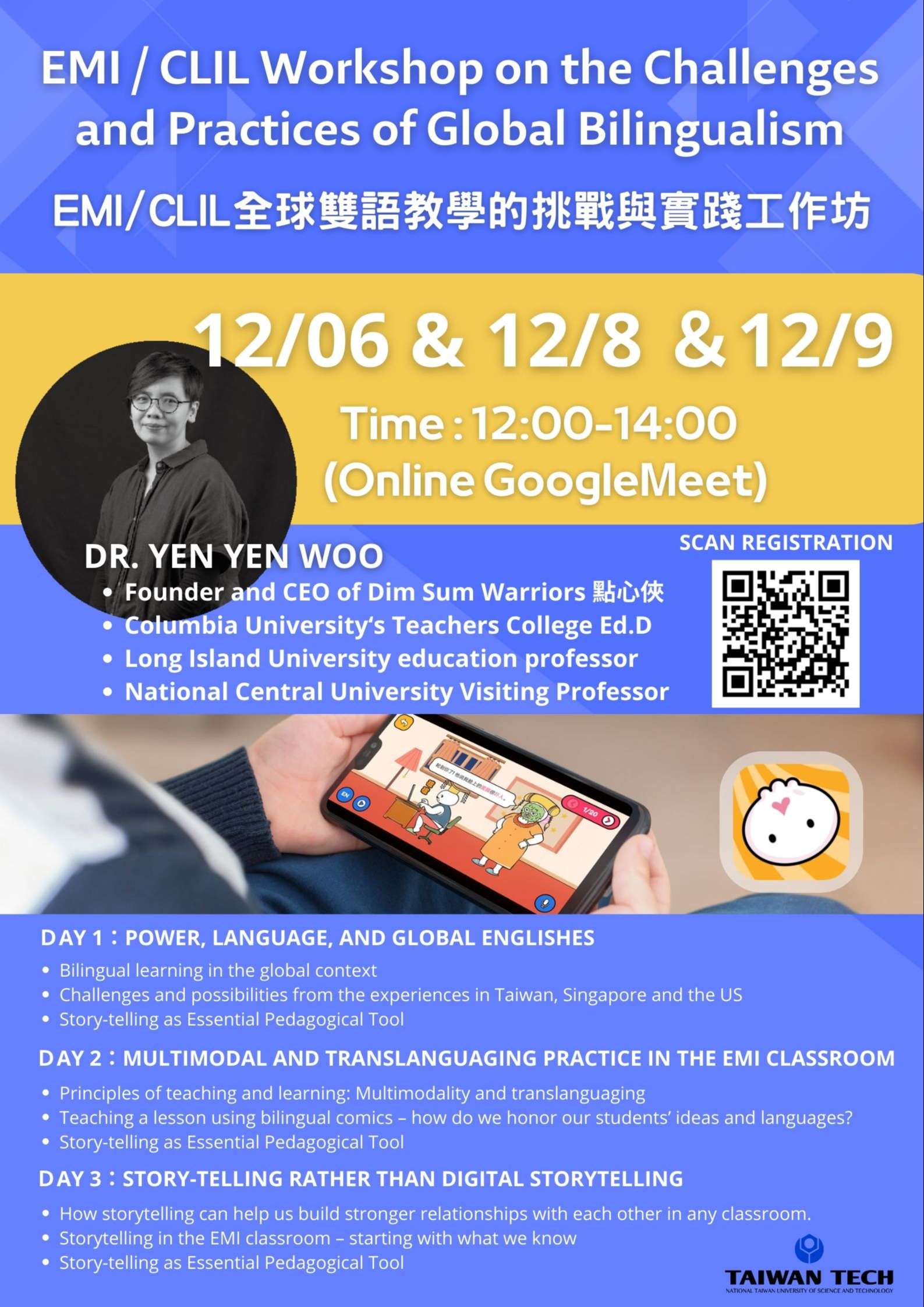 二、旨揭工作坊分別辦理12/6、12/8及12/9場次,可核發全國教師在職進修網研習時數,請先至以下表單進行報名:https://reurl.cc/kqaDM9。