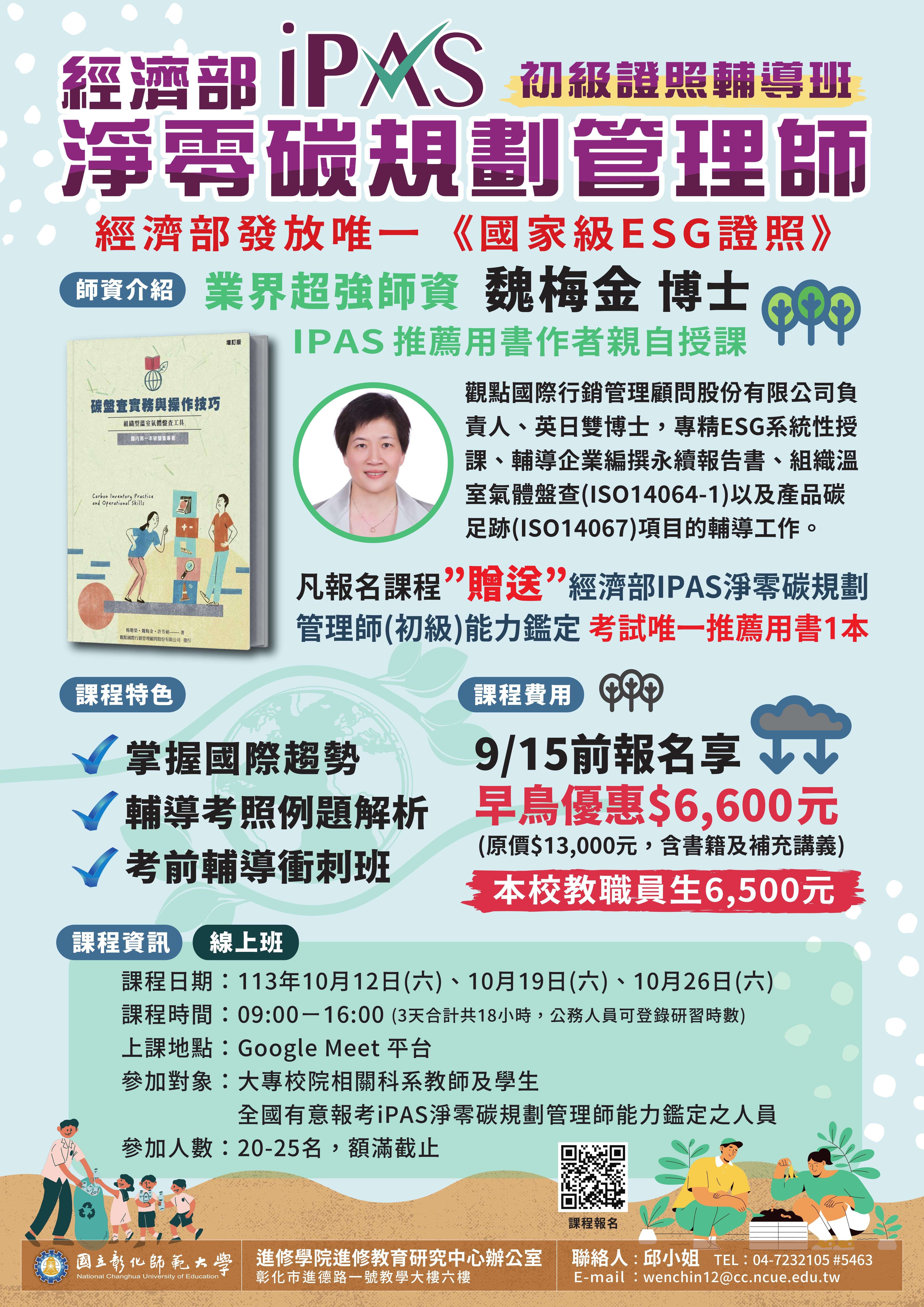 一、「113年iPAS淨零碳規劃管理師(初級)能力鑑定輔導班(線 上班) 」