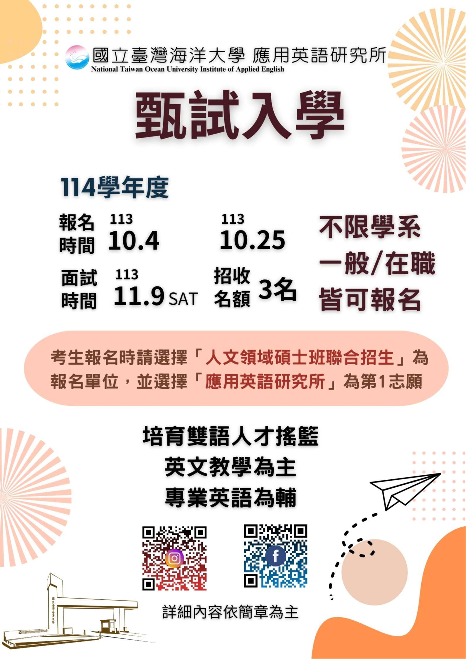 二、本校應用英語研究所114學年度碩士班甄試入學招收一般生3名(在職者請以一般生報名)。
