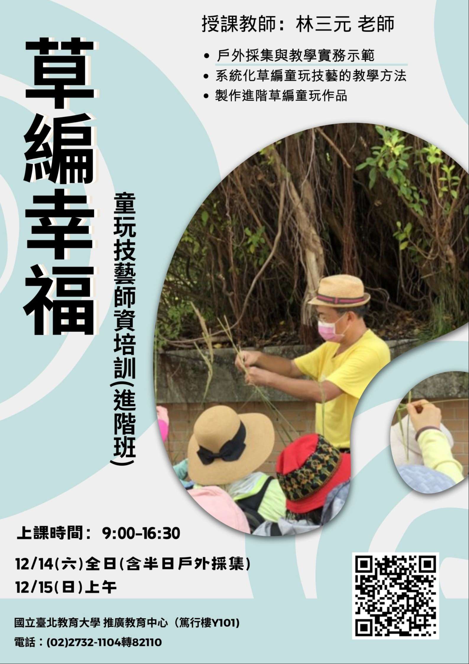二、草編幸福-童玩技藝師資培訓(進階班):113年12月14日(六)及12月15日(日)共9小時,全勤並通過評核將核發研習證明書。課程特聘專業草編達人「草編CEO林三元老師」親授,包含戶外採集、戶外與教室型態的教學示範、教學計劃撰寫、教學經驗分享等,歡迎18歲以上對草編童玩有興趣之教師或一般民眾報名。