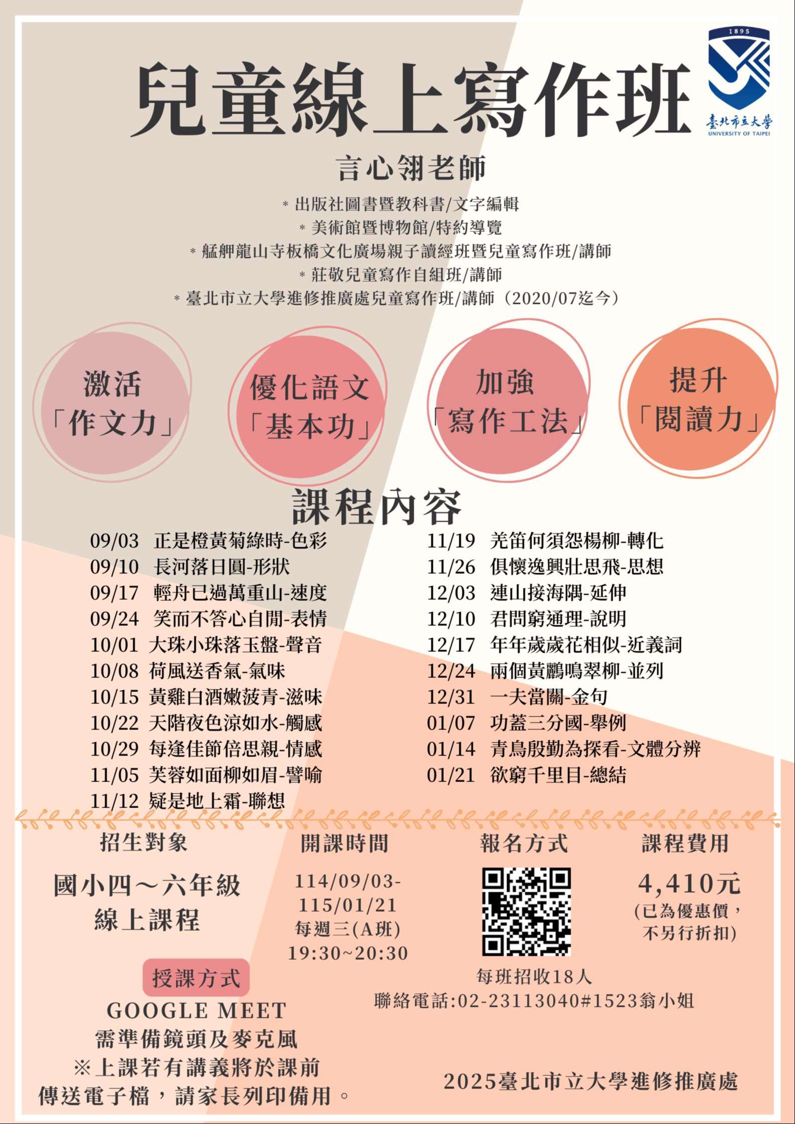 六、檢附課程招生海報1份,如有課程相關疑問,請逕洽本案承 辦人翁小姐(02-23113040轉分機1523)。