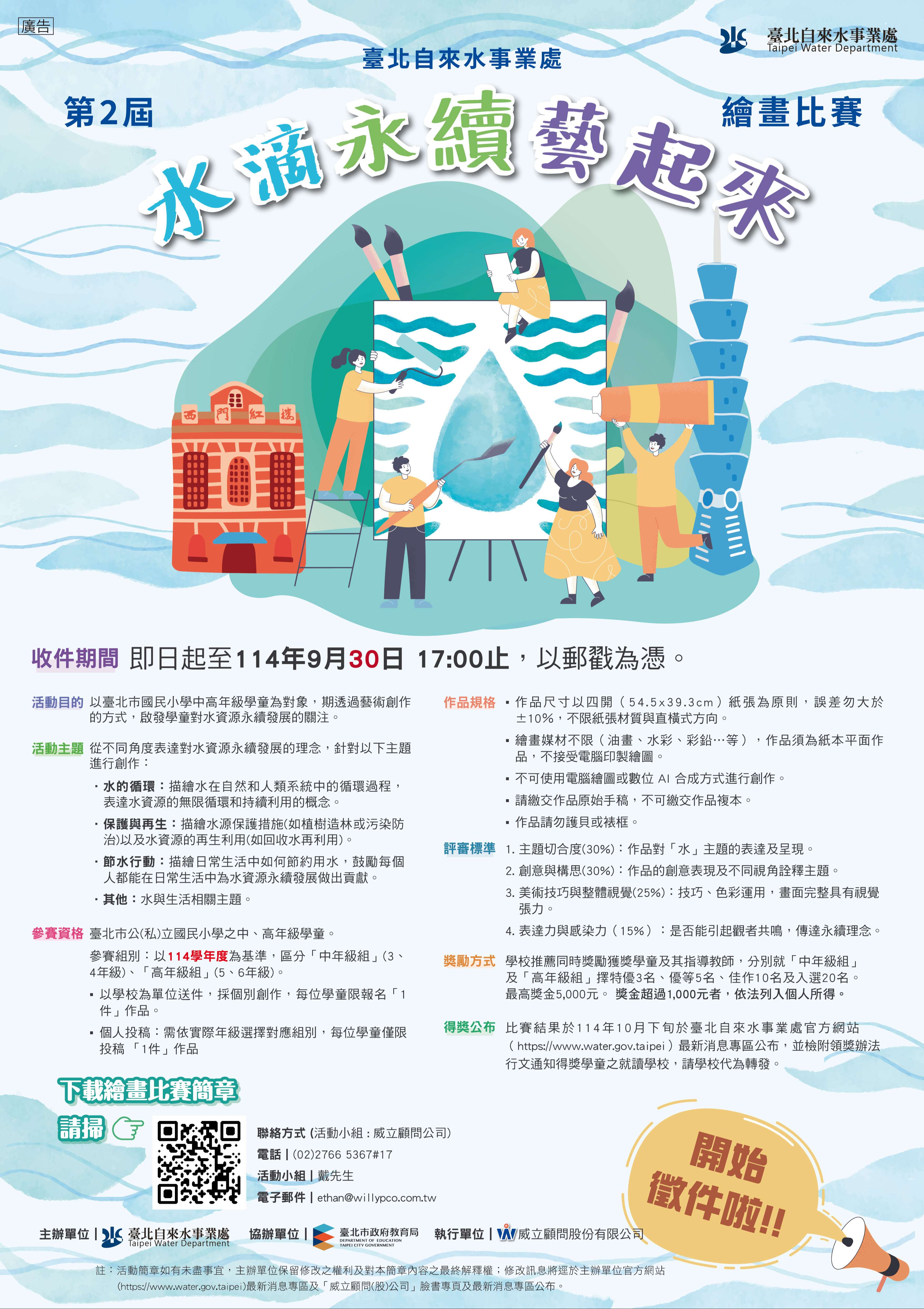 二、檢送114年第2屆「水滴永續藝起來」繪畫比賽簡章及海報 更新版各1份(如附件)。