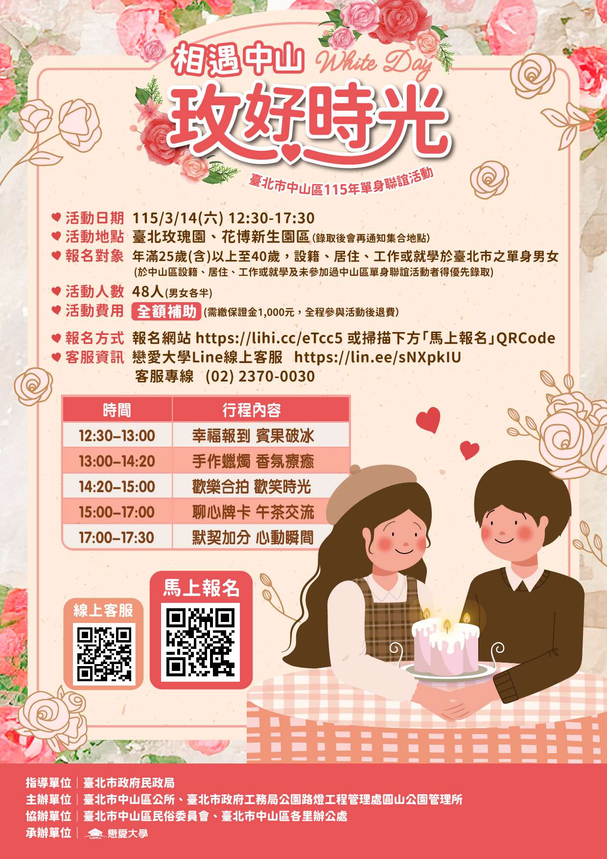 二、請貴單位惠予協助於所屬網站宣傳,文稿內容如下:「臺 北市中山區公所『相遇中山 玫好時光』單身聯誼活動,將 於115年3月14日(星期六)12時30分至17時30分假臺北玫瑰園及花博新生園區舉辦,活動名額為男、女各24人,共 48人,歡迎年齡 25歲以上至40歲於本市設籍、居住、工作或就學之單身者踴躍報名參加(於中山區設籍、居住、工作或就學者及未參加過中山區單身聯誼活動者得優先), 活動詳情請參閱官網或電洽(02)25031369分機593鍾小姐。」