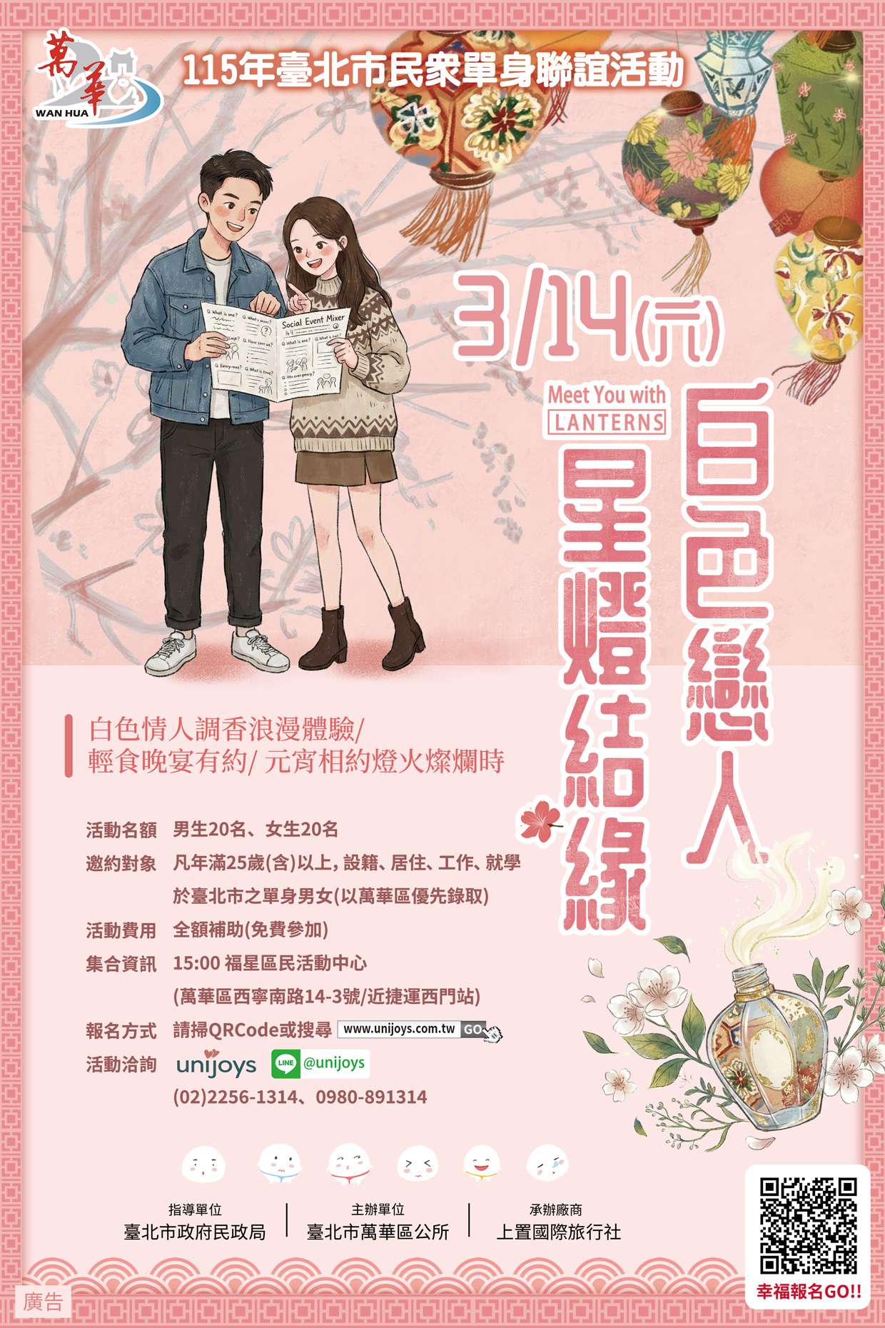 二、請貴單位協助於所屬網站及粉絲團宣傳,文稿內容如下: 臺北市萬華區公所115年度單身聯誼活動「白色戀人星燈結 緣」,將於115年3月14日15時至21時於西門町周邊舉辦, 線上報名時間自1月19日起至114年2月27日或額滿為止,凡 年滿25歲以上,在臺北市居住、工作或就學,並且有穩定工作者(以萬華區者優先錄取),總計40個名額,男女各 20人, 免費參加, 活動洽詢( 02) 2256-1314、0980- 891-314洪小姐或至網站瀏覽查詢。