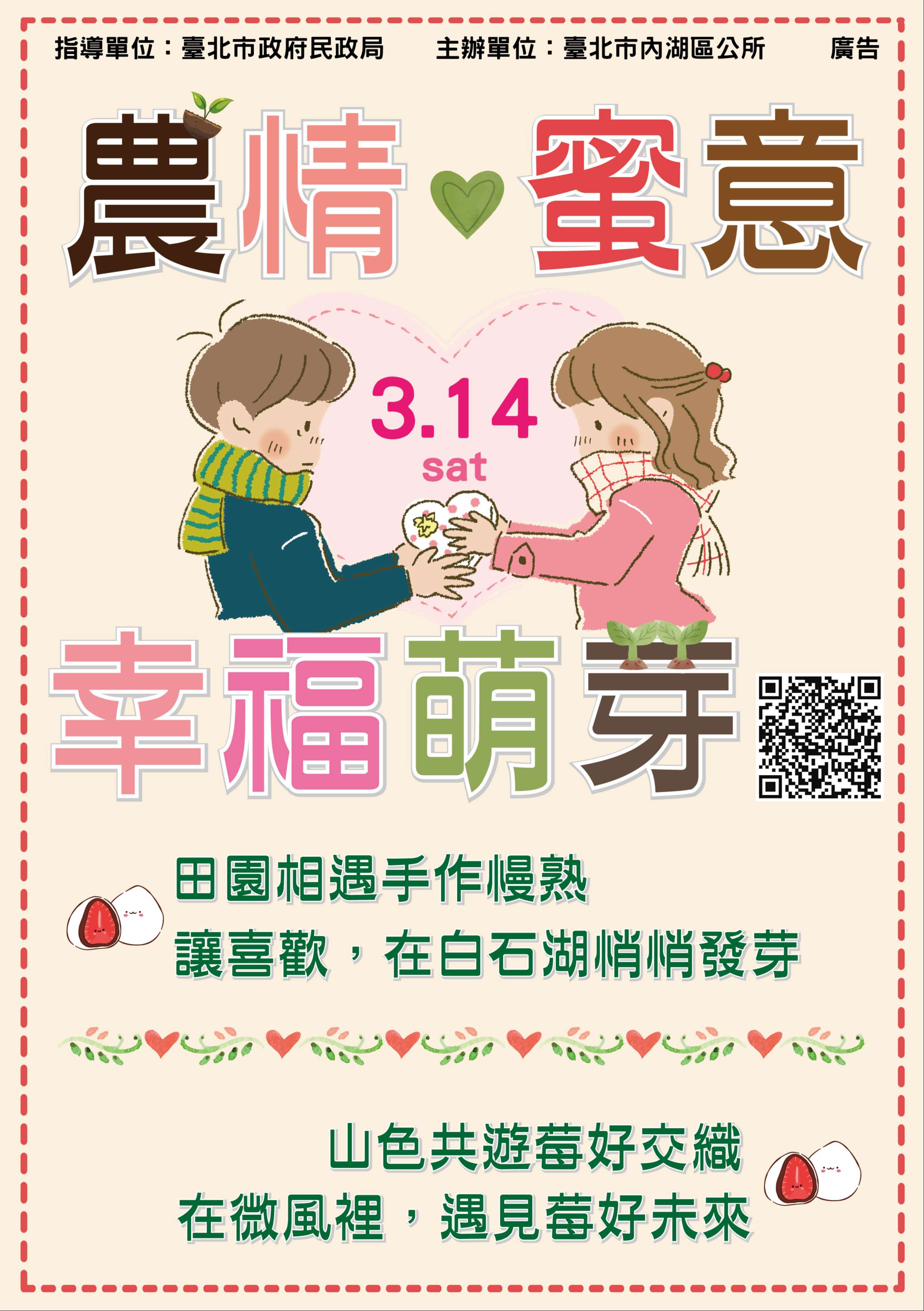(三)90字版:想認識新朋友、為生活加點心動嗎?內湖區公所推出「農情蜜意・幸福萌芽」單身聯誼活動,結合自 然體驗與輕鬆互動,打造零壓力交友環境。名額有限、 報名即將截止,臺北市單身男女快把握機會,一起讓幸 福萌芽!