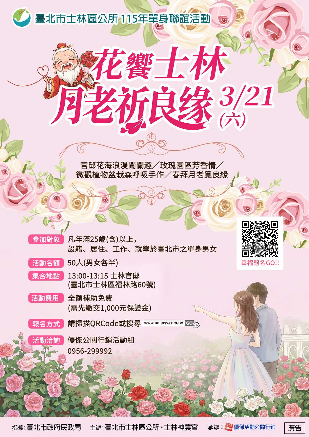 二、宣傳文稿如下,請參酌使用:「臺北市士林區公所將於115 年3月21日(星期六)辦理『花饗士林-月老祈良緣』單身 聯誼活動,名額為男、女性各25人,歡迎年滿25歲(含) 以上,設籍、居住、工作或就學於臺北市之單身者報名參加,活動詳情請參閱報名簡章。」
