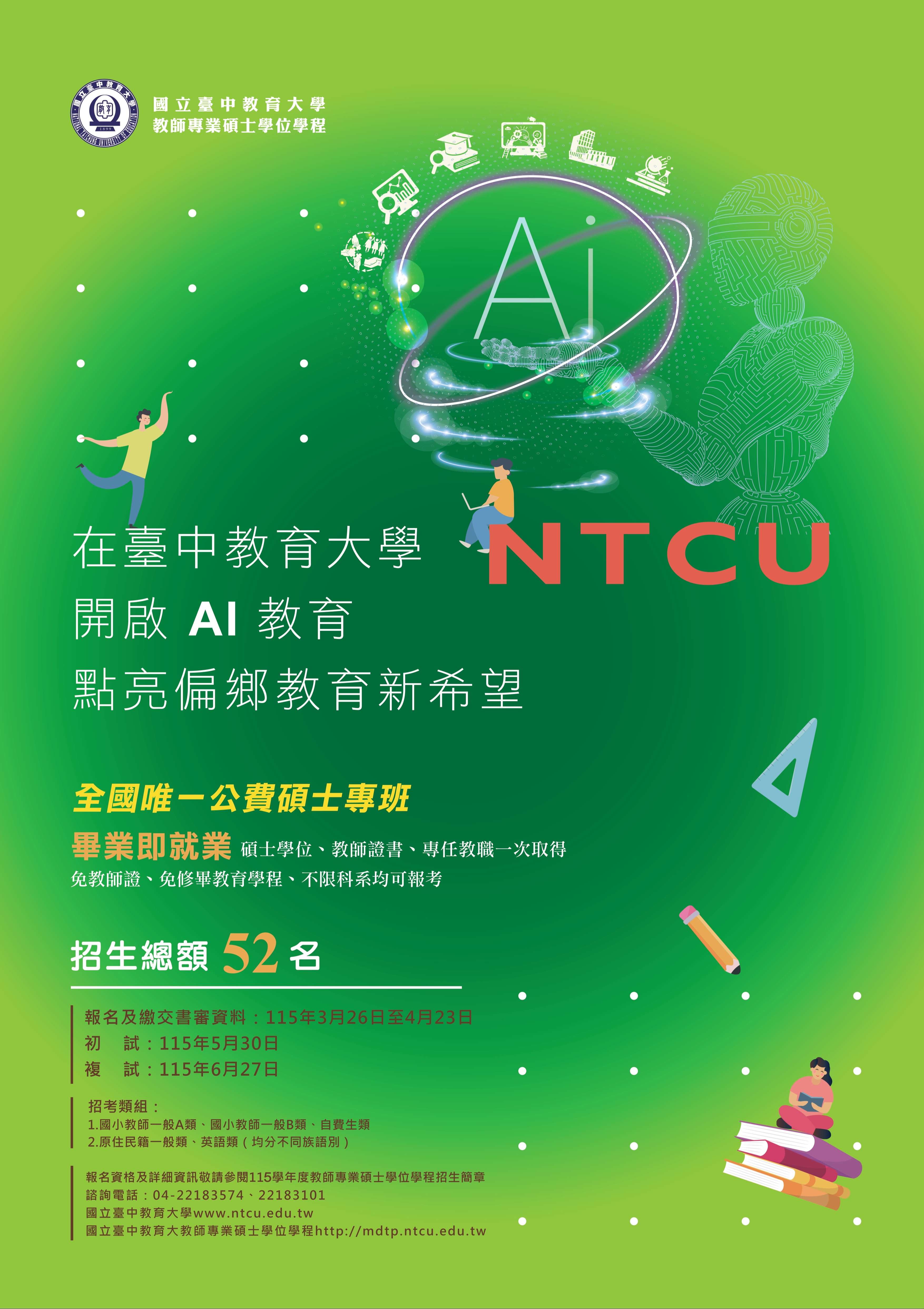 一、國立臺中教育大學教師專業碩士學位學程為碩士公費師資專班,教師證 書、專任教職、碩士學位一次取得,歡迎有志投入偏鄉教育志業的學子及代理代課教師報考。